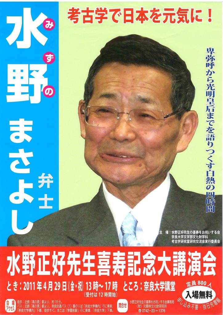 ◆近つ飛鳥博物館で面白いチラシをもらったので掲げておく。水野先生が4時間しゃべりまくる。これはすごい。統一地方選挙の折、選挙ポスター風のデザインもよし。でも、もうちょっとイイ写真もあるんとちゃうの、とは思うが。水野先生、元気である。行ってみたいが、明日は測量だ!