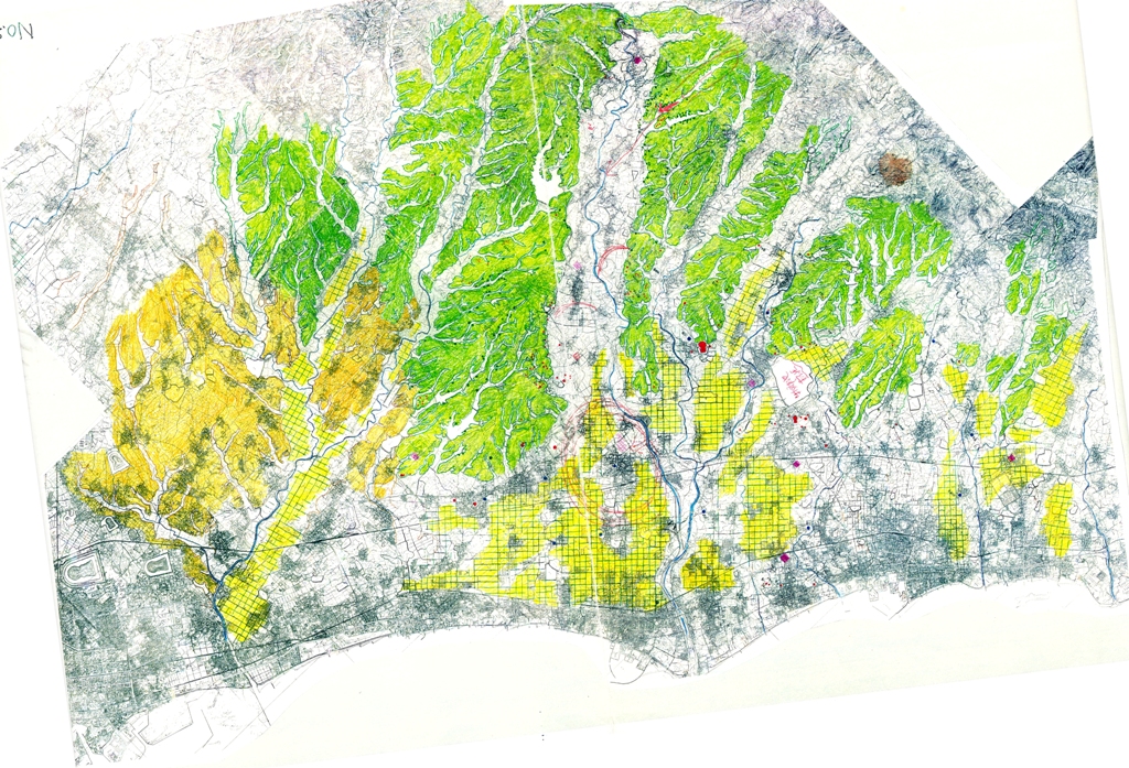 ◆この時、大阪府航空写真地図をコピーし、貼り合わせ、なって言ったっけ、そうそうクーピーという色鉛筆で、遺跡を落としていったが、そうなると山を書く、平野部をみると実に見事な条里地割が地図に現れており、一生懸命に作図した。この巨大な巻物はしばらくこの部屋に存在していたが、デジタルで画像化したので捨てた。しかし、人間が無心に色をつけ、遺跡を落とし、いろいろと考えてみる、そういう営為は大事ですね。