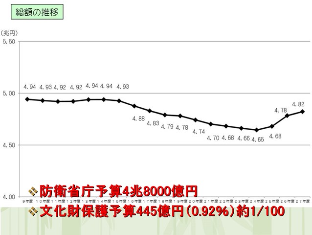 真が累々と出てくる。頭を銃で撃った瞬間の写真も、刃物を何十本も突き立てられた遺骸・・・、など。これを画像で示すのはやめたが、日本人2人がとらわれている画像を出そうと思っていた。がこれもやめた。で、最後に自国の問題として、いまの安保法制の議論とか、日本国憲法の話をして(卑弥呼共立と通じます)、グローバルホークとかオスプレイとかイージス艦の話を持ち出し、最後に文化財保護予算の話で終わろうと。が、思っていたようにはしなかった。卑弥呼共立に学ぶべし、というところまで。