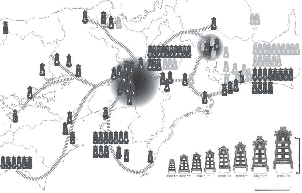 銅鐸です。出雲や吉備は青銅器を廃し首長墓を発達させたと。それでもいい。けど、畿内が後期になってもまだ銅鐸を作っていることが後進的だとかは、まったく思いません。