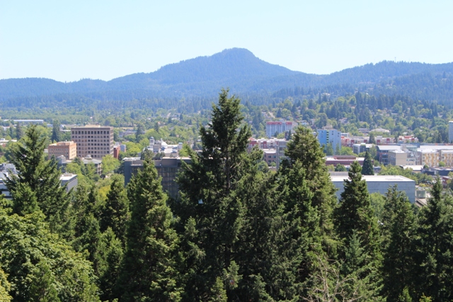 て、建物の向きからだいたい わかるのだが、緑が多いので、道路がほとんど見えませんでした。列車も近づいてきて警笛を鳴らし続けながら駅に入ってきました(山の下)。また、ウィラメット川の流れも見える。