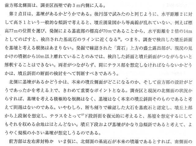 ◆ちなみに、寺澤さんが検出した前方部西北隅付近の葺石が墳丘そのものという点については、「前方後円墳の墳丘規模」『大阪市立大学大学院文学研究科紀要 人文研究』第55巻第2分冊(2004年)に書いたことがあります(右、一部抜粋)。大阪市大のリポジトリで全文PDFでダウンロードできるようになっているはずです。
