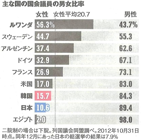 ◆わたしは公職・公務員はすべて半々とはじめから定員を打てばいいと思っている。男女が同じ選挙区で争う必要はないと思っている。ひとつの選挙区で、例えば男1と女1枠があり、2票投じればよい。公務員試験でも、採用を、男○人、女○人、同数で設定する。そこまでやれば、世界一だろう。むろん、人の生き方はそれぞれ。ただし機会は均等にある。逆差別でもない、という世界。