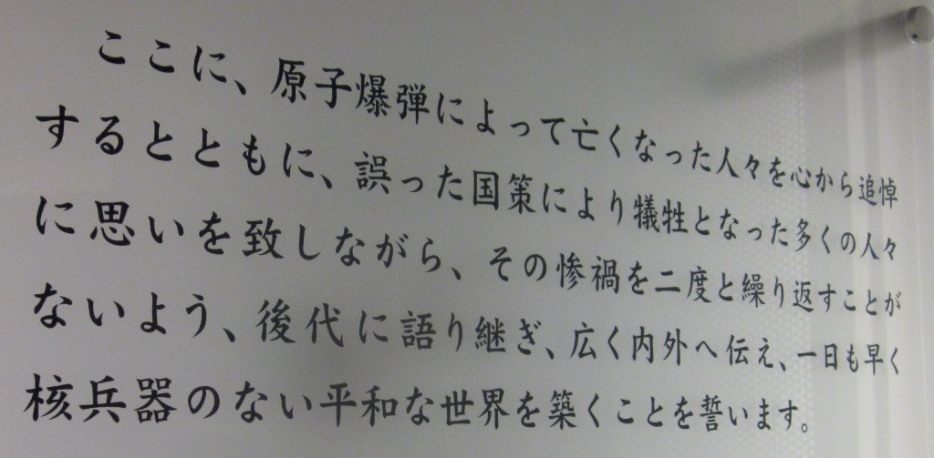 【銘文】原子爆弾死没者を心から追悼するとともに、その惨禍を語り継ぎ、広く内外へ伝え、歴史に学んで、核兵器のない平和な世界を築くことを誓います。