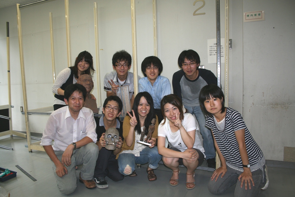 ◆これでなんとか解体してしまい、小分けにすれば動かせそうな見込みが立つ。途中、ガラスが割れる事故もあったが、さいわいケガはなかっった。なんとかこの日、14:40から始め、21:00までに、歴史学の研究室のならぶ2階踊り場へ再設置し、遺物の配列まで、移転を完了することができた。写真は19時頃か。最後まで作業を続けてくれた実習生たちと記念写真。、