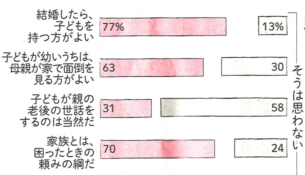 ◆子育てグラフ。家で子供を育てるのがよいが63%らしい。カミさんいわく、その下の、親の老後を家族がみるのがよい31%くらいと、同等くらいにならないものかと。我が家は出生後2か月から保育園育ちです。ちゃんと育っています。そう考える人々はそうすればいいのだが、比率です。こういう考えが、女性は結婚したら子供を産んで家に入り・・・という、医学部不正入試にもつながり、就職のバイアスにも、日本ではまだ生きているわけです。