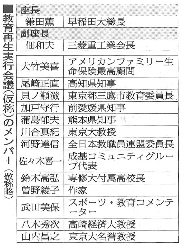 ◆11日の新聞に標記の会議のメンバー表が出ていた。首相および文相の肝入りのこの会議・・・。27dd7dbf.JPG7f95eb9d.JPG