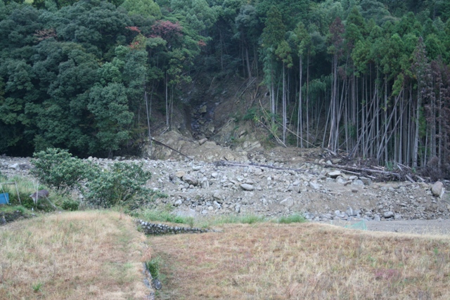 ◆忘れていたが、このあたりは昨年の水害被害の著しかったところ。実は紀南は昨年の教室旅行第一候補で準備が進02bdefa1.JPGめられていたのだが、水害のため、広島に急遽変更したというイキサツがある。那智に向かう道すがら、川沿いに岩がごろごろとあり、流路を埋めた岩が両脇に掻き上げられている様子がよくわかる。那智の滝のところもそう。落下した手すり等もそのままだし、えぐれ、コンクリートを吹き付けた様子も見える。滝の近くまで重機が入れるように鉄板が敷かれてあった。