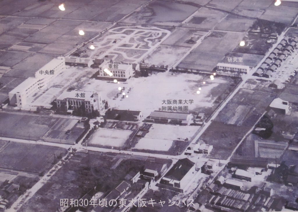 ◆古い写真は昭和30年という。まわりは田圃だらけだ。河内のど真ん中にあり、戦後、10年くらいはこんなもの。ちょうど大阪府の航空写真地図の頃である。これは近世大坂ではなく、1階の大学史の展示部分のもの。この昭和30年の写真のあと、建っていった建物の写真を見ると円形校舎があった。応神陵の横にあるやつ。誉田中学校も有名だが、実は、オレの小学校、加古川市立川西小学校も円形校舎で、校歌にも謳われているのだが、いまは解体されてしまった。