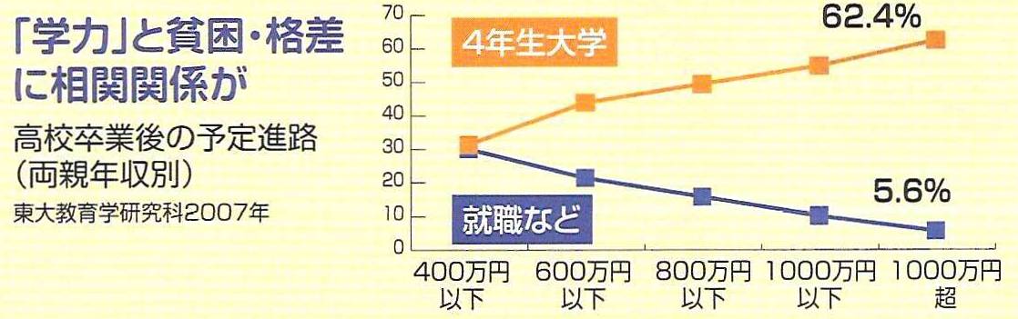 ◆まずは学力と家庭の経済状況の相関。ま、データはもっともっといろいろあるのだろうが、これは高卒後の進路の比8b70eaa1.JPG率でやっている。ま見事に相関しています。