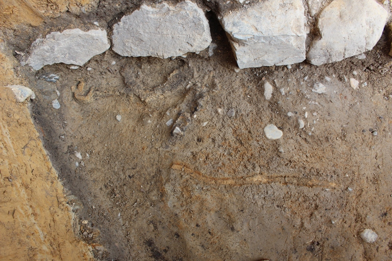 込まれたので、さらに精 査。そうすると、基底石に接する半円形の木質から柄のようなものがのび、隅部の黄色とくっつき一体化した。木製鐙か、ということになる。写真撮影、標定点打ち→フォトスキャン用写真。最初に竹竿、と言っていたものも、「鐙?」とよく似ているようにも思う。昨日までは、何かわからん残存物で、むろんモノはなんとか取り上げ、材質鑑定や年代測定をやってみるが、それくらいかと思われた。が、俄然、馬具かもしれないものがあるとなると、素人では取り上がらないし、元興寺の塚本さんに電話し、夕方に見に来てくれることになる。(摂南大による葺石再撮影)。
