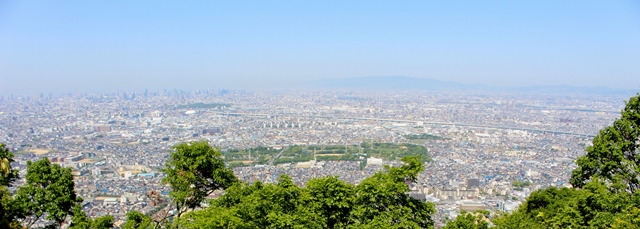 ◆山頂から大阪を見た写真(上)。なんでも年に数度は明石海峡も見えるのだとか。最後、先端まで行き、京都方面を眺める。天王山と男山の地峡部もよく見える。まあ、絶好の立地ですね。