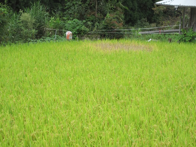◆地籍調査の立ち合い2日目。で、谷を上がっていく前に集落を抜けていくと、あれなウンカやと。 今年はだいぶはやっとる、と教えてもらいました。ウンカ被害は写真のように丸くやられるのだそうです。学ぶことは多い。