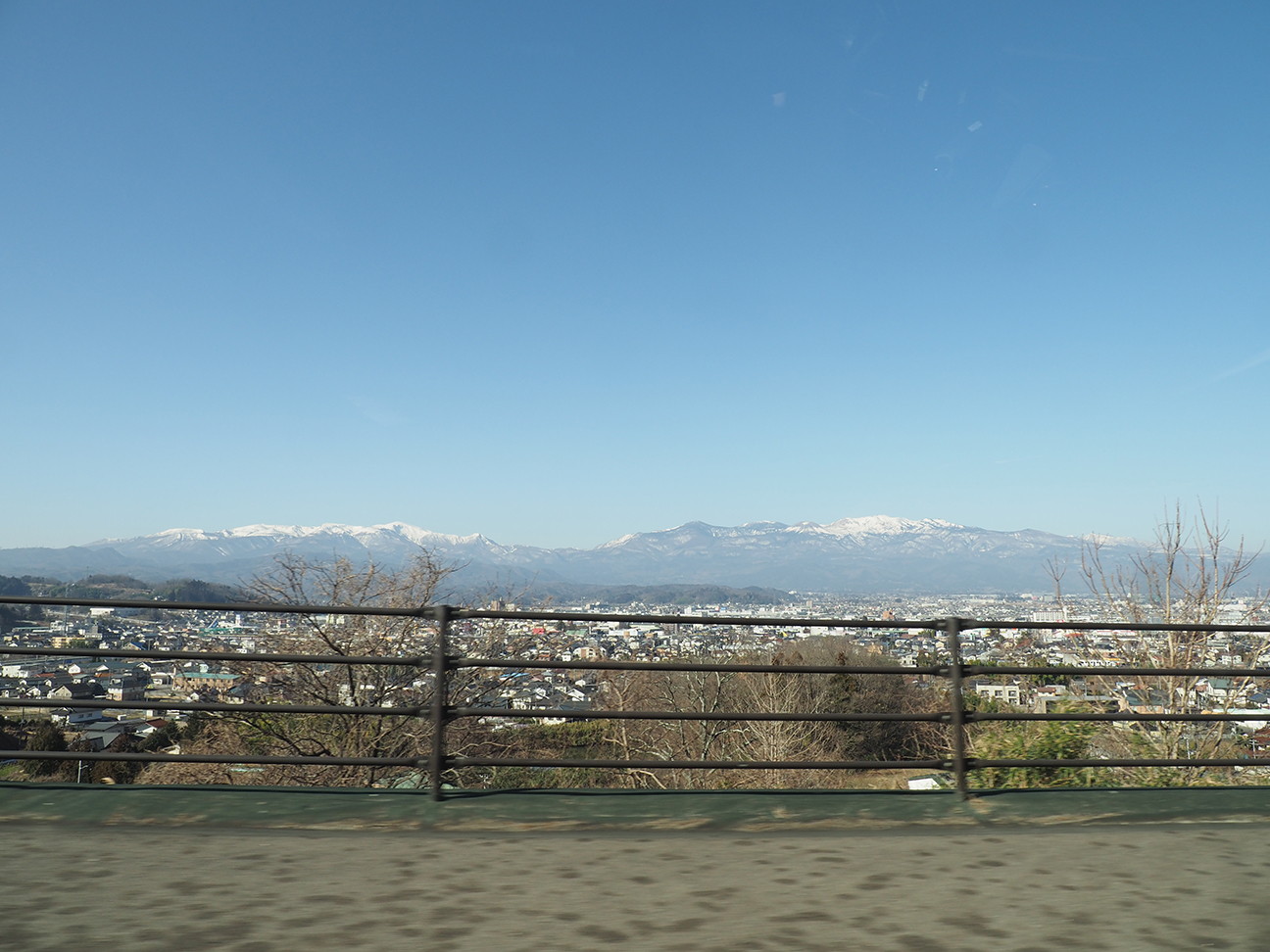 といけない。桜井古墳のあと、来た時と同じ地道で福島に向かう。飯館村を通ると、放射能の計測装置がところどころに立っている。福島に近づくと、中通りのむこうの雪を被った山並みが美しい。安達太良山なのだろうか。