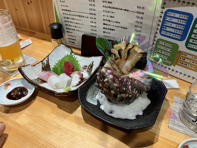 ◆まあしゃーない。ホテルに入る。そして天晴という店に歩いていく。前に来た時も、Tさんと飲みに行った店だが、昨年、店を別の場所に新しくしたとのこと。予約客が多かったが、2人なのでカウンターに座ることができた。夜光貝を食べました。レンタカーも延長。