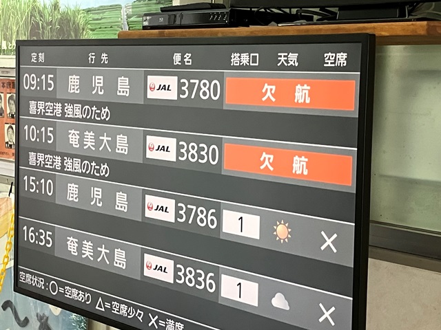 ◆そこからがたいへん。まず飛行機は、翌26日便は、午前便がもう埋まり、午後便もJALとしては埋まり、空いているのが27日の午後便とのこと。まずそれを押さえる。その上で、この奄美・喜界便は、なんというのですか、ANA枠が4席あるのだそうです。調べると、26日午後便は残り2席というので、それも押さえる。もし翌日に飛行機が飛べば、午後便には乗れる。26日も欠航であれ