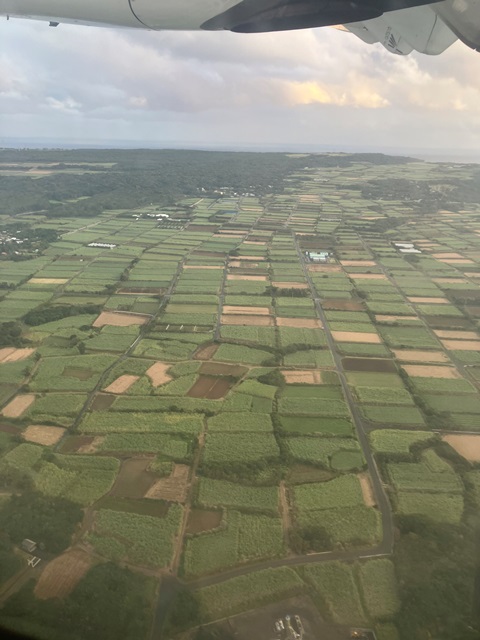 ◆画像は、喜界から戻る飛行機から撮影したサトウキビ畑。ずいぶん整った圃場になっている。