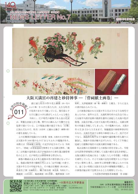 ◆17日にカミサンの同級生との呑み会に参加。上方の歌舞伎に詳しい美術史家。いまは大阪天満宮の研究所におられる。いまやっている大阪の歴史文化研究に、とっても必要な方である。わが社の図書館にある、大塩の乱で焼けた天満宮再建時の砂持神事を描いた巻子があることを伝え、後日、画像を送ったが、むこうも大学ミュージアムをめざすニュースレターにたどりついていた。図書館の担当にも話をつけておいた。もうひとつ、うちの近世史の卒論で、天神祭りを扱ったいい論文があり、残念ながら大学院に進まなかったが、近世史T先生の本か科研報告書か何かに発表していたものがあったと記憶しており、それも送ろうと思う。大阪天満宮は大塩の乱の火災で史料なども多くなくなってしまったよう。しかし再建された本殿は、その後、1945年の空襲で市中の神社の大半が焼け、最古の建物になっているそうである。