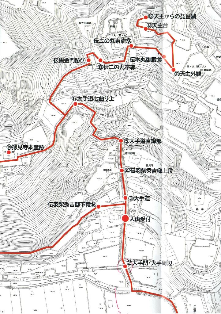 突き当たりで西に折れ、そこから北に進み、東に進んで本丸に行く。そこに虎口の目立つ石垣もある。そこを抜けて本丸中枢部に進むと、天守台の下の廓に建物があり、行幸用の御殿と推測されているようだ。先の大手道の階段は、この廓の南東に取りつくのだが、この廓の南面石垣がすこぶる見ごたえがあるものに感じた。しかし、通常の見学ルートでは、この石垣の上の廓にある建物跡は見ても、その下、南面の石垣を目にすることはなく見向きもされない。この日、この廓の南端まで行き、下の石垣を見下ろしたわけだ。けっこうな高さの石垣が東西に長くのびている。安土城の石垣で、これがもっとも迫力があるのではないだろうか。しかしいまは未整備で、人を入れないようにしており、みな知らずに素通りなのである。下の画像でいえば⑧の文字の下にある石垣です。