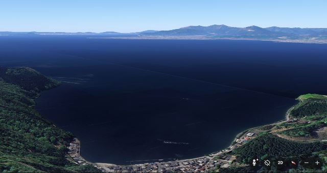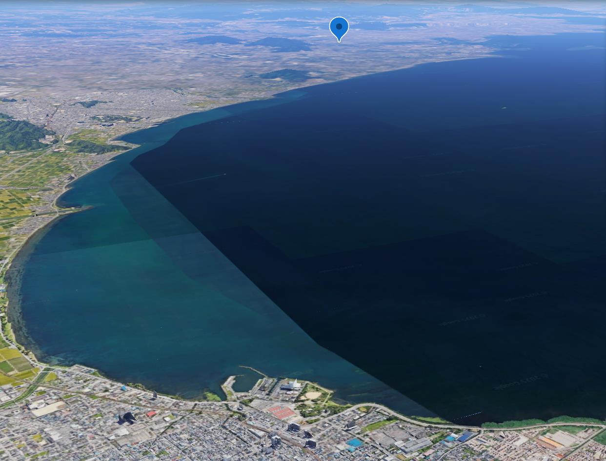 ◆菅浦で三尾城はどこだろうかと見ていた。いまグーグルアースでその角度から見たところ、あの山と思っていたところであっていた。