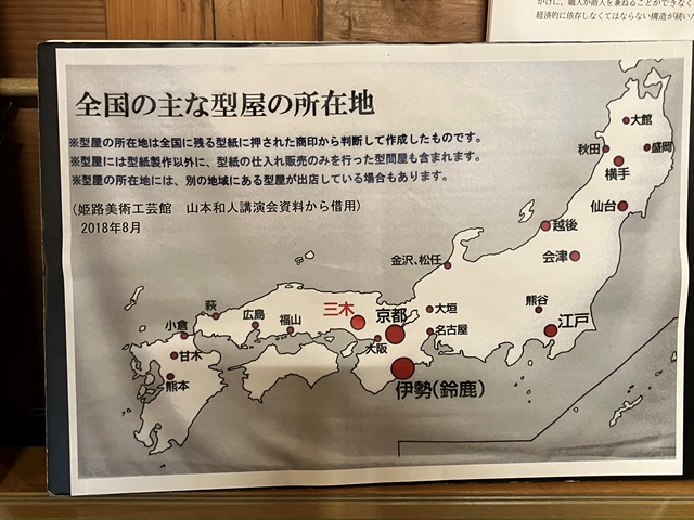 ◆もうひとつ、着物の染色用の型紙も特産とのことを、屋内の展示で学ぶ。型紙というのは伊勢が有名なんですね(知らなかったが)。文様を切り抜き、それを反物に置いて蝋を引き、そこには染料が載らないようにする。文様は白ということだ。三木もまた、けっこうなシェアを占めていたのだそうです。