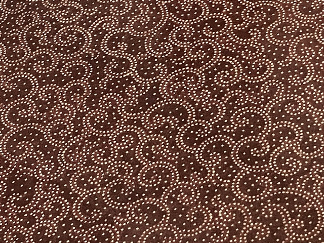 ◆切り方にもいろいろあり、半円形の彫刻刀をくるりと回して円形に抜く作業をされていた。切り抜いた、柿渋色の0.5mmくらいの円形が散らばっている。われわれより上