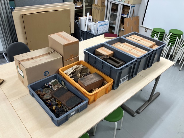 ◆それと山根徳太郎が難波宮の調査を開始する時に参考にした、法円坂の微地形(等高線間隔が20㎝とかなんでしょうか)の地形図。これは大学史行きかな。それと博物館を担当することになった2012年に購入した拓本道具。発掘に使った手バチの鉄身が山ほど。これはすぐに捨てた。