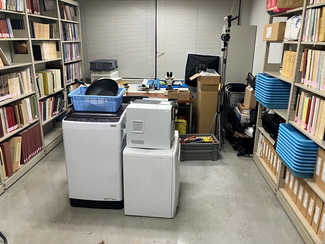 片付け。このくらいがちょうどいいかも。暗室と133を片付けた。写真は器材庫から処分のために運び込んだ洗濯機と乾燥機などを133に集めた様子。午後は、暗室内の雲雀山の資料の箱詰めをやり直し、こっちが14時から院入試説明会で抜けた後は、301の展示遺物の養生をやってもらう予定。