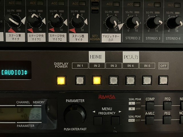 ック。ワイヤレスマイクがしっかり充電器に入っておらず、ぜんぜん充電されておらず、すぐに黄色→赤色に変わる。危なかった(乾電池をもっていればよい)。それと、展示ケースを運ぶ台車3台と、A1ポスターを貼るパネルボードを2台借り、136に搬入。さらにポスターの印刷。それからSさんと打ち合わせ。打ち合わせする相手がいて話をすると、とても安心できる。天気も回復して晴だそうです。画像は操作パネルです。演題上の電源でなく、ここの電源を入れ、HDMIケーブルは演台上のものに差し込む。ひととおりやると、まあ大丈夫です。
