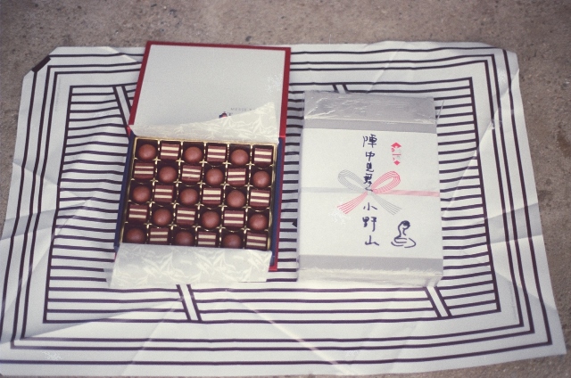 ◆先生と撮った写真はなさそうだ。1枚出しておく。これは椿井大塚山古墳の測量の時なので1988年?、陣中見舞いに来られた時のもの。小林行雄の測量の方法を教えていただいたのは、たぶんこの時。『発掘調査の手引き』には書いてあるのでは。アリダードでのぞくとして、テープで距離を測るのとは違うやり方。写真は差し入れのチョコを撮影したもの。