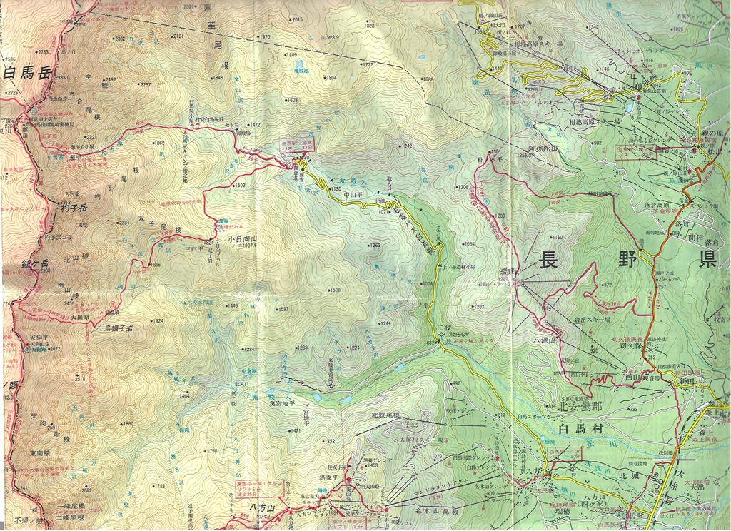 ◆で白馬岳。翌朝、猿倉までバス、白馬岳2932mに登る。そこから撮影した黒部川の写真を記憶している。このマップを見ていて、栂池に下りたような気もするが、定かではない。糸魚川に出て、北陸線で京都に戻る。