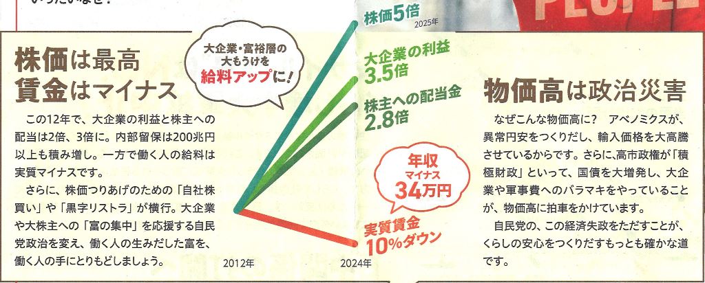◆画像は、同じ共産党のペーパーから。こないだ史学概論でやった話とまったく同じ。このグラフのうち、教育費がガタッと落ちたところに、史学概論の準備をしていて気づき、まったく驚いた。この国が、次世代を担う学生を育てようという気持ちがなく、軍艦や戦闘機などをそろえることに嬉々としていることがよくわかる。高市が大勝すれば、憲法改正に全力をそそぐだろう。実質的に軍隊をもちながら、憲法上は明記されていないことを書き込む。それだけを見れば、現実にあわせるだけと思われるだろう。が、自衛権にもとづく軍事力でなく、その先へ進むための1歩になってしまうことを見通さなければならない。