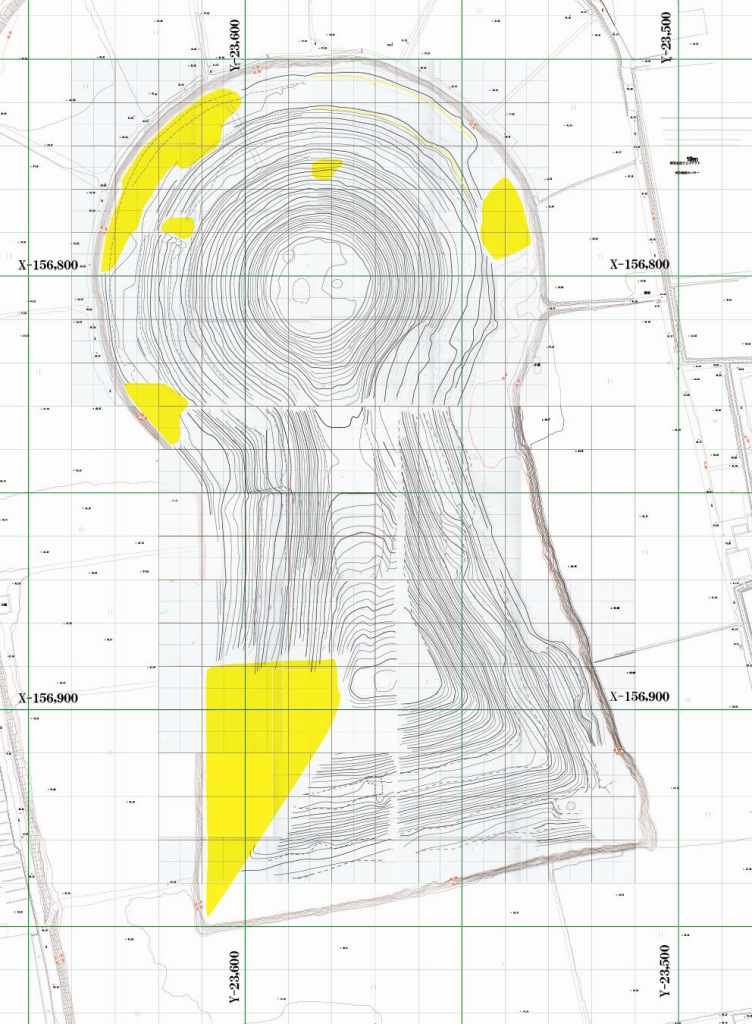 ◆P3に据え替え。(1)墳頂部の窪みおよび等高線を入れる。(2)斜道部の25㎝コンタをまわす。