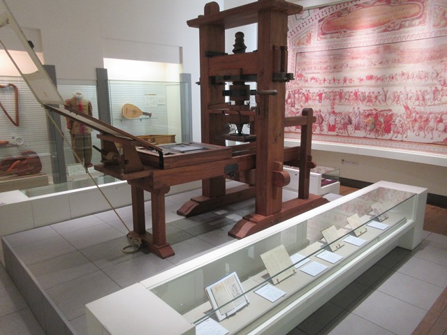 ◆翌日、天草下島の西海岸を下り、崎津へ向かう。いろいろ資料館などがある。崎津を抜 け、その奥の天草コレジオ館へ。天正少年遣欧使節は活版印刷機を持ち帰り、いくらか印刷物を発行している。その印刷機の模型があって(写真)、職員の人に説明いただいた。本物が残っているわけではないが、持ち帰ったであろう当時のものを調べ、ドイツ?かどこかに残っているものから再現したと、この展示物を設置するまでの苦労を聞く。1990年会館なので30年以上前のこと。この