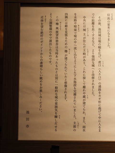 ◆池田市の実情はわからないが、最後に面白いパネルでの説明文があったので、示しておきます。この櫓、白壁・瓦葺の外郭塀、目の前にある庭園、これらはすべて池田城になかったツクリモノということである。市としては、城なんだから城らしくという、文化財保護部局とは別の市長部局の要請に押し切られたんでしょうね。