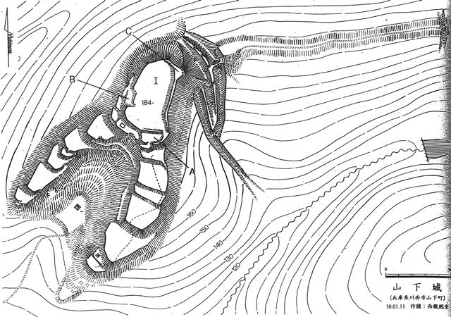現在も今西氏が居住する屋敷地は、かつて外堀をめぐらした方2町(約216m四方)の範囲があったとされ、その中央に南北1町(108m)、東西半町(54m)の居宅を構えるものです。発掘調査でも、その堀跡などの遺構が各所で確認されています。