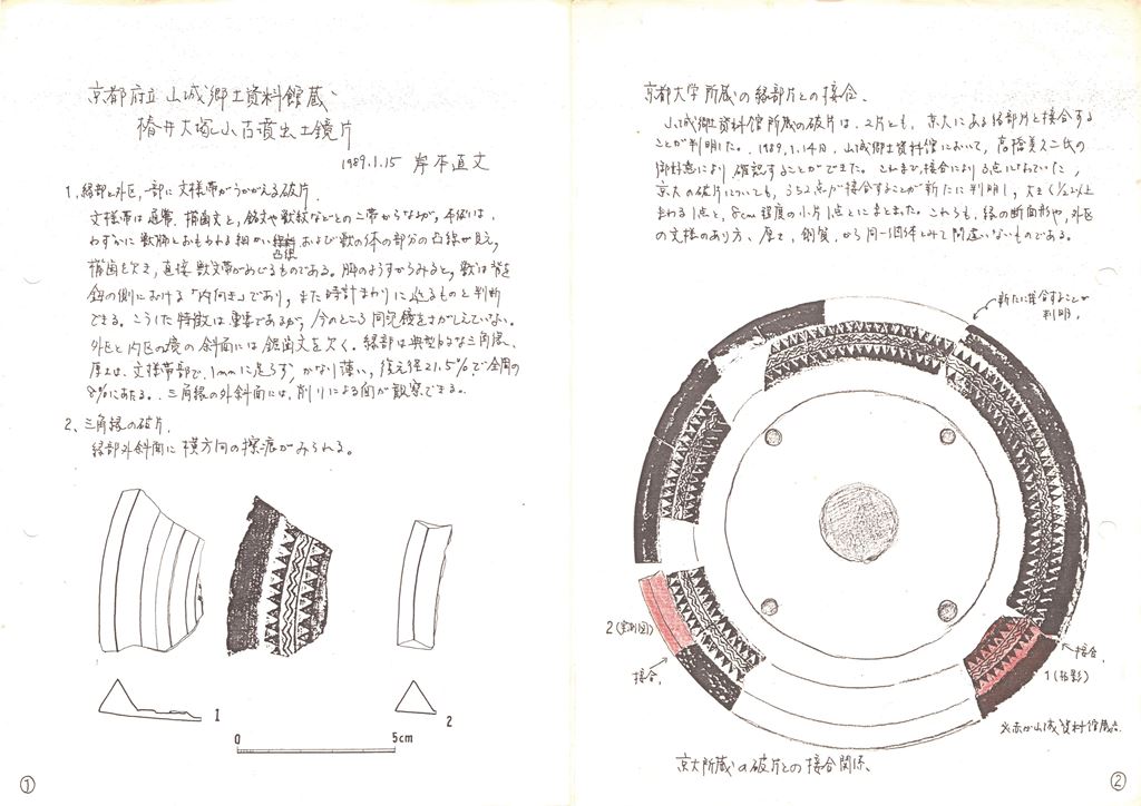 ◆定年退職にむけてというより、あと2年半で森之宮に引っ越しなので、少しずつ部屋のブツを 片付けている。京都教育大学に「椿井」出土という三角縁神獣鏡片があることを、1989年1月7日に(豊中であった埋文研の時)、高橋美久二さんに教えられ、その後実見し『京都考古』に紹介した(53号、1990年1月刊)。1月14日に京教に行っている。めっちゃ早いですね。M1には時間があるんだ。というか、高橋さんがすぐ動いてお膳立てをしてくれたのでしょう。一緒に行ったのだろうか、記憶は定かでない。この関連ファイルを片付けたという次第。