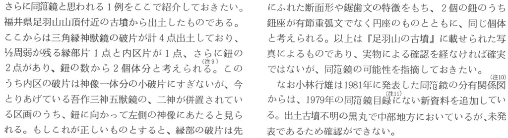 ◆右は原稿化した『京都考古』の関係部分。足羽山の破片にふれている。この比較作業をやったわけだが、福井県というと、その時点では足羽山しかないし、見つけたとはいえない。が、書いた文章は、新たに足羽山破片の同笵関係を自分で見つけたように書き、小林の中部においた出土地不明鏡はそれとは別とするような書きぶり。実際、これら同笵関係の図を『京都考古』に出しており、6面目があるように書いている。