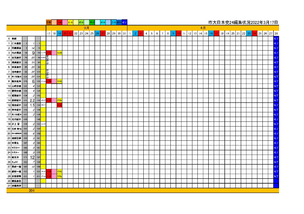 ◆さてこの3連休は伏見城に全力投入です。とはいえ、メールを見ると、ヒストリア4月号と、市大日本史の初校がきていたので、それを処理したら11時。さらに市大日本史の原稿関係で13時。とほほ。また例年の表を作りました。年のうち普通の勤務時間の1か月分くらいは従事しているのではないか。12年たったら、丸1年分。来年こそは交替という話もあり、期待しよう。