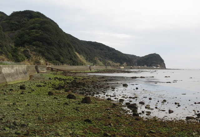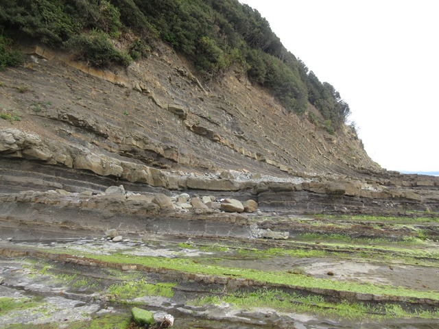 ◆で、さきっぽの灯台をめざす。引き潮で、岩場が現れてきている。で、先端部は海食崖となり、砂岩と泥岩の互層で、傾きをもつ地層が露出、こうい