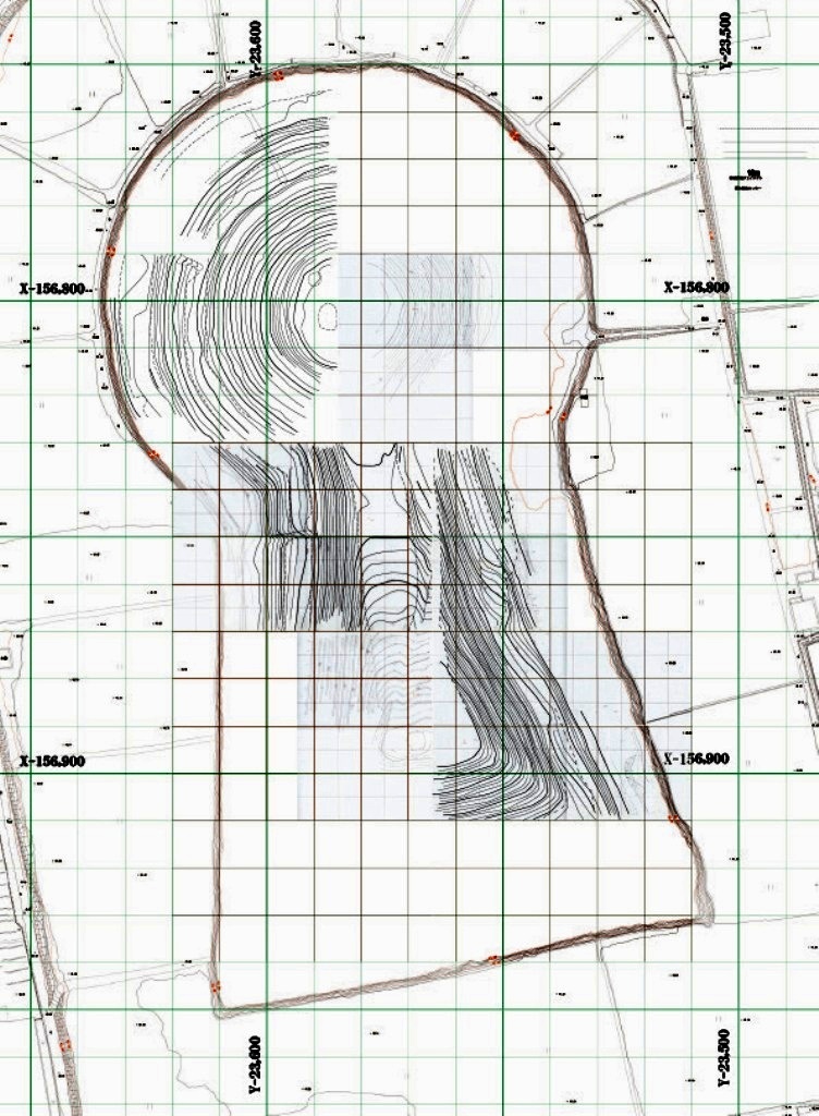 ◆参加。自分・山﨑・吉田・清原・金井。本日は5人なので2班。P6に立てている後円部の応援に行く。ちょっと測点の取り方が問題なので、本日は1日、チビミラーをもち、埋まっていない範囲を上からひたすら埋めにかかる。後円部墳頂西側のP6で下段までほとんどぜんぶを測量する。下段テラス面までは等高線を追うが、崖状の下段斜面については、見やすい基準杭直交方向の見下ろし4方向程度について列で高さを下げ、43.5mまで測る。なので紙の北側と西側が少し残っている。