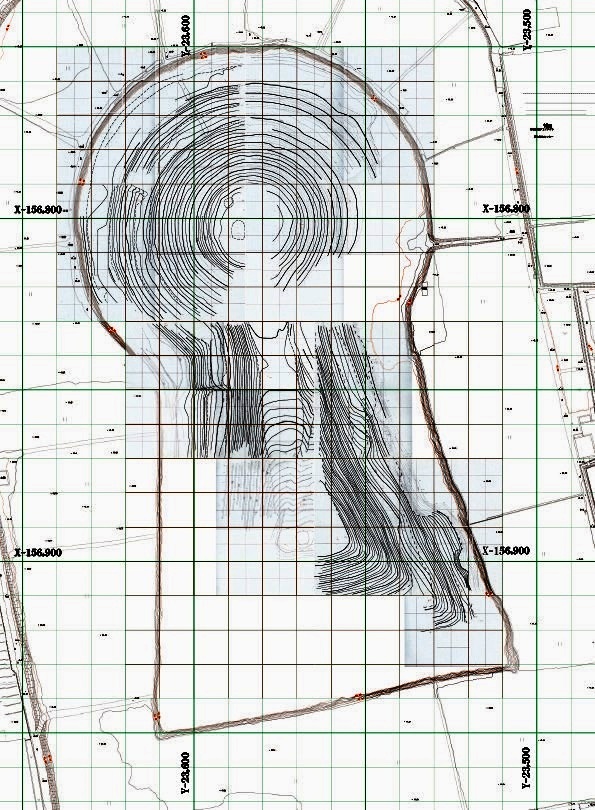 ◆本日も後円部に貼りつく。P4からの北斜面。最初だけチビミラーをもち、墳頂部、それから後円部2のサラ紙にテラス2面の下場と肩を入れフレームを作り、あとはTS読みに徹する。