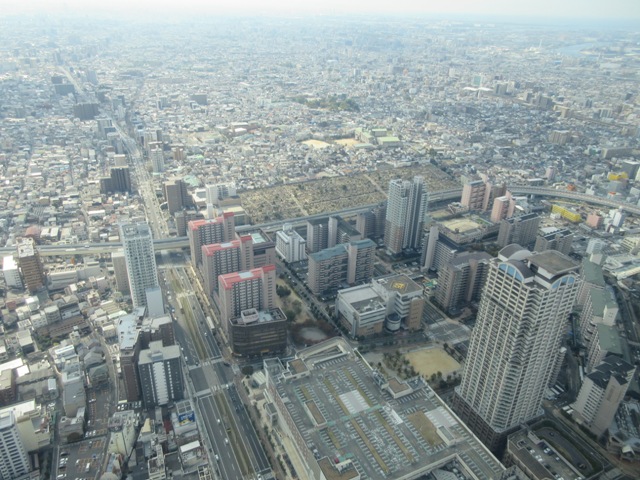 ◆冬場、絶好の天気の時に、手頃なランチぐらいで入り、オリンパスのカメラで撮影大会をしたいものです。地上57階はすごいわ。写真は南に移動してコンデジで撮った一枚。四角い区画が大阪市の南霊園で、五代友厚が眠っている。その横、阪神高速のRの内側が飛田新地です。