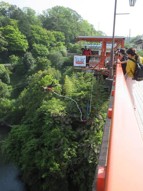 ◆バス乗り場が何か所かある。八尾側のケーブル駅へ向かうバス停は、なんとか橋というのを渡る。深い谷をせき止めたダムにかかる橋で、登録文化財なのだとか。そこでバンジージャンプをやっていた。初めて人が飛び込むのをナマで見ました。