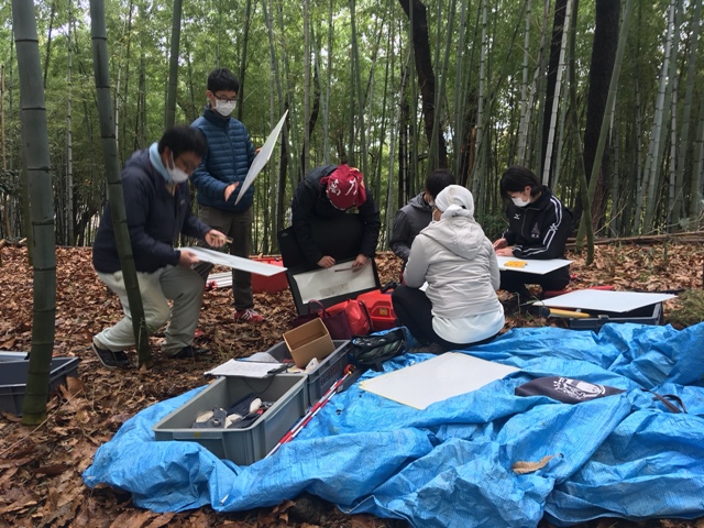 ◆昨日、測り方を示したので、1日、金井がチビミラーをもち、等高線を下ろしてくれました。最後は、P4からがしんどくなったので、主軸方向の下段テラスに打ったP11に据え変えて中段裾から下段テラスあたりで終了。なにぶん、西より竹が密生している困難はありましたが、上段・中段、そして下段テラス面まで、サラ紙のほとんど9割を埋めることができた。