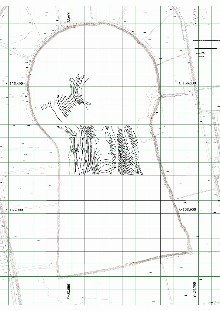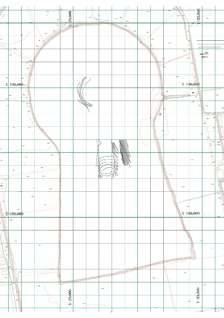 ◆参加。自分・山﨑・吉田・清原・金井。本日は5人なので2班。P6に立てている後円部の応援に行く。ちょっと測点の取り方が問題なので、本日は1日、チビミラーをもち、埋まっていない範囲を上からひたすら埋めにかかる。後円部墳頂西側のP6で下段までほとんどぜんぶを測量する。下段テラス面までは等高線を追うが、崖状の下段斜面については、見やすい基準杭直交方向の見下ろし4方向程度について列で高さを下げ、43.5mまで測る。なので紙の北側と西側が少し残っている。