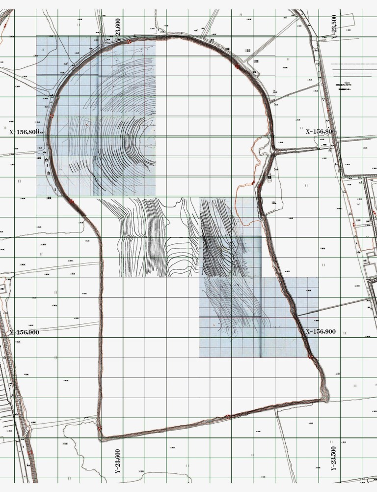 ◆本日も後円部に貼りつく。P4からの北斜面。最初だけチビミラーをもち、墳頂部、それから後円部2のサラ紙にテラス2面の下場と肩を入れフレームを作り、あとはTS読みに徹する。