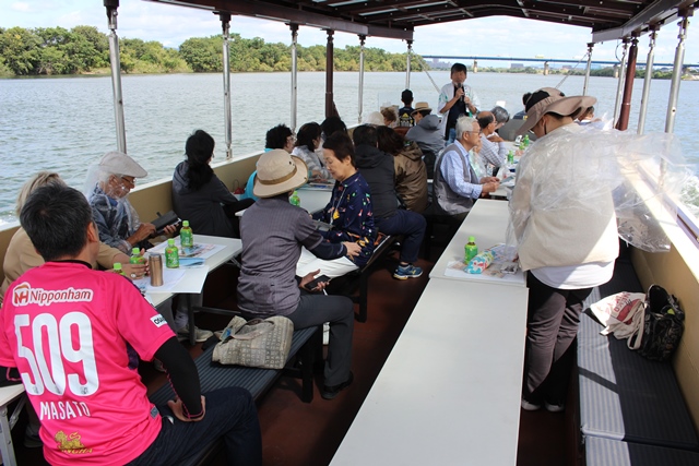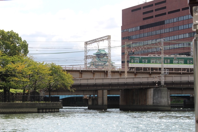◆6日は、大阪歴史演習の履修生らの誘いで、八軒屋浜から枚方までのクルーズに。朝、9:45集合。10時に出発、ガイドさん1人と、歌を歌う人1人。すぐに大阪城が見えてくる。手前は京阪電車。いや大阪城天守閣はかなり近いですよ。大川に面した台地先端に築城したことがよくわかる。