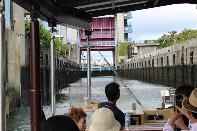 ◆淀川が北に曲がり、左に造幣局が見えてくる。せんぶ館が見えてくる。ほどなく毛馬閘門。三つの水門があるとの説明を聞いたが忘れた。新淀川の方が高く、大阪側から 入り、閉じられ、淀川からの水が導かれ、次第に水位が上がっていく。10分くらいかかるのかな。淀川側のゲートが開き、、船は淀川へと進む。すぐ淀川大堰。