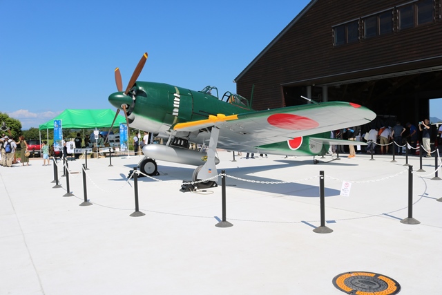 ◆鶉野飛行場では、特攻隊「白鷺隊」が編成され、63人が亡くなっている。その慰霊碑前で、地元のガイドさんが熱心に解説していた。6月に紫電改の実物大模型が設置されたことがニュースになっていたので、見に行く。まあ、それから間もないし、多くの人が訪れていた。もともと、鶉野飛行場が、川西航空機姫路製作所組立工場の専用飛行場だったもので、軍も使うことになったもの。で、紫電改の組み立て工場も近傍にあり、試験飛行をしていたとのこと。